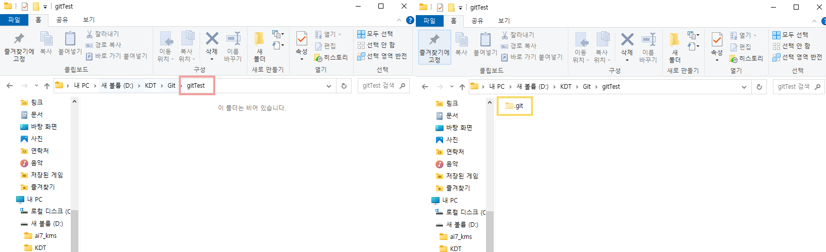나는 D드라이브에 테스트 폴더를 만들어서 경로를 D: 드라이브에 있는 gitTest 폴더로 변경해준 후 git init 명령어를 썼다.