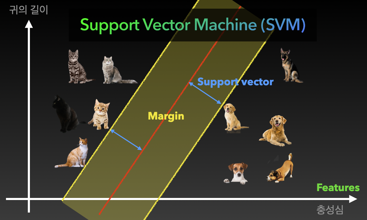 SVM은 두 클래스로부터 최대한 멀리 떨어져 있는 결정 경계를 찾는 분류기